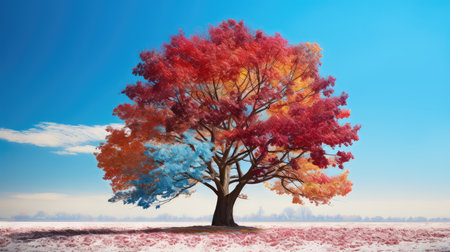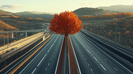 Captivating view of a deserted highway flanked by vibrant autumn foliage and a striking red tree, embodying the beauty of nature and tranquility.