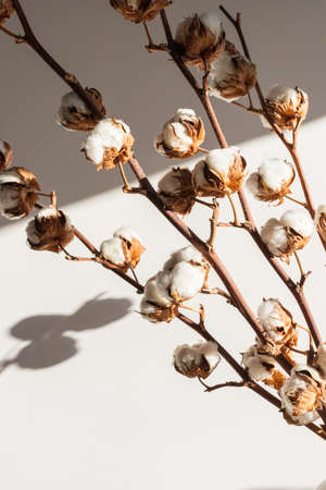 Dry cotton inflorescences on a light background in the interior shot with hard sunlight.