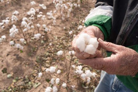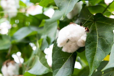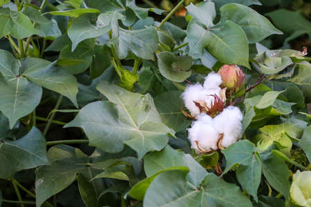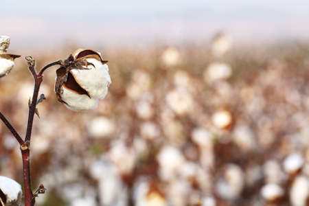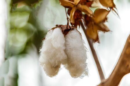 View of an agricultural cotton field. Seeds wrapped in white fluffy cotton wool. Israel