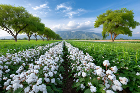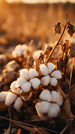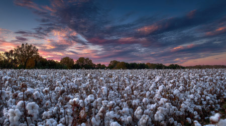 A stunning cotton field glows under a colorful sunset sky filled with dramatic clouds. This serene scene captures the essence of nature's beauty and agriculture.