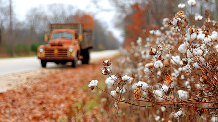 Roadside scene in autumn featuring a rusty vintage truck parked on a country road next to a field of dried cotton plants, with fall leaves scattered across the roadside.