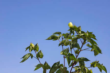 Flowers and buds of a cotton plant close-up on a background of blue sky.