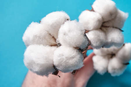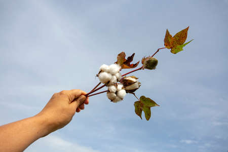 Woman hand holding dried white cotton flower isolated on white background. Fabric cloth softness natural organic farm allergy concept