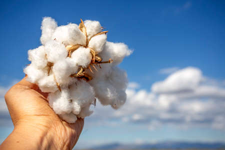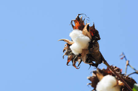 White cotton flower on blue sky background. Cotton flowers in the garden.