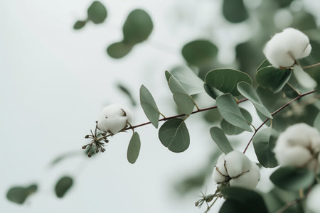 CloseUp of Cotton Bolls on Eucalyptus Branches with Soft Greenery in Natural Light.