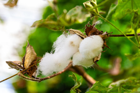A close-up of a cotton plant with fluffy white cotton bolls growing in the sunny weather of Peru