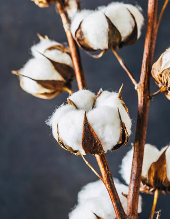Close-up of natural cotton bolls on stems with a dark, moody background for contrast