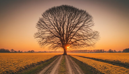 A wide dirt road stretches towards a solitary bare tree in a golden field, illuminated by the warm hues of a vibrant sunrise.