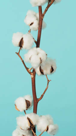 Cotton branch. Real delicate soft and gentle natural white cotton balls flower branches on light green background. Flowers composition. flat lay. top view. minimal style.