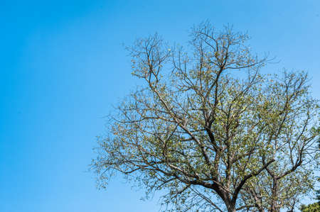 Tree with bare branches in nature on a sunny spring day and blue sky in the background. Close up and copy space for text or design