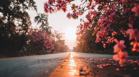 An asphalt road stretches into the distance, framed by trees laden with pink blossoms. Warm sunlight bathes the scene, creating a soft, diffused lighting effect. The composition uses a low-angle perspective. Suitable for travel, nature, or seasonal themes in advertising and editorial contexts.
