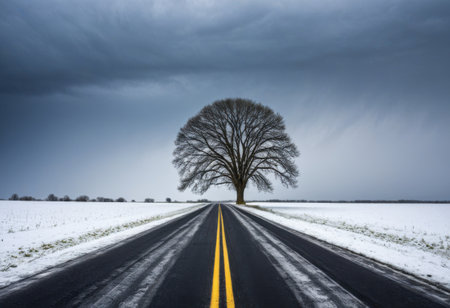 Snowstorm approaching over empty rural road, lone tree on the side of the road, dramatic sky