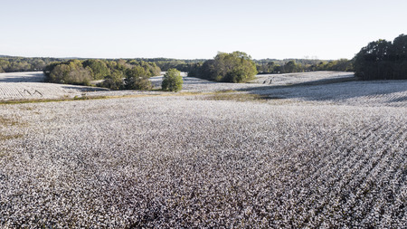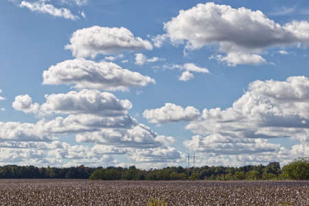 A cotton farm in rural Georgia during the Fall close up blurred background with clear blue sky