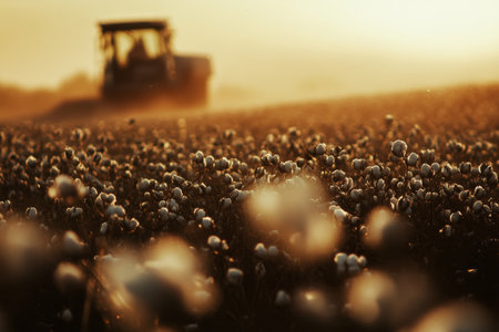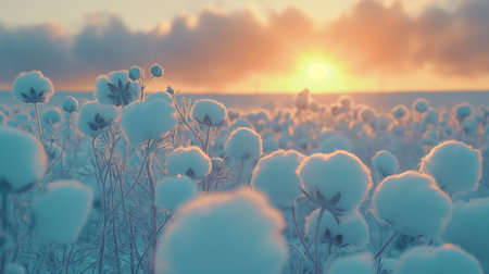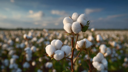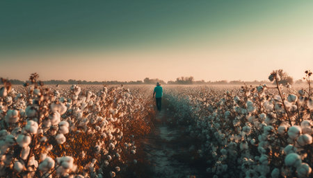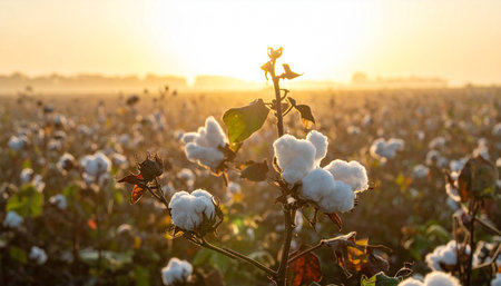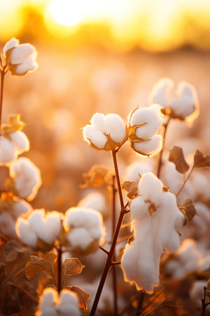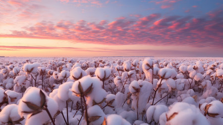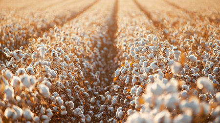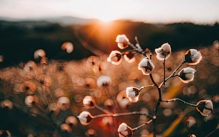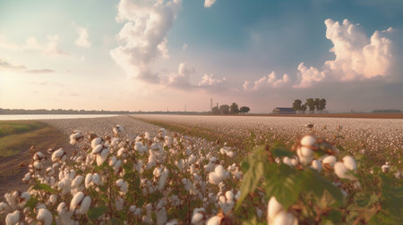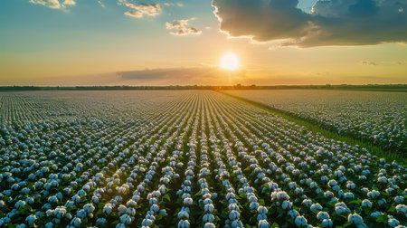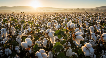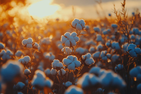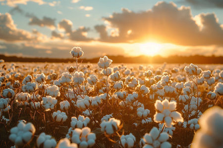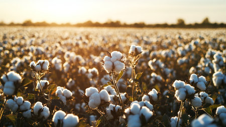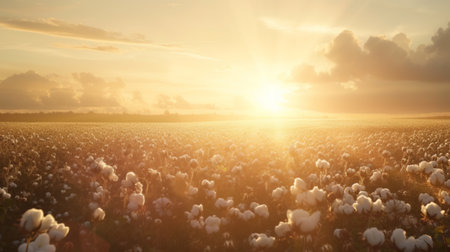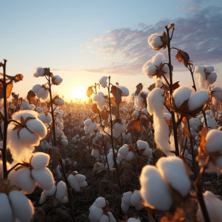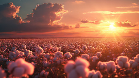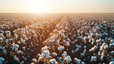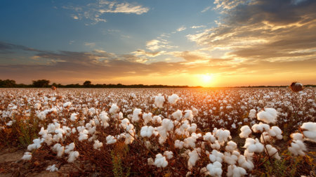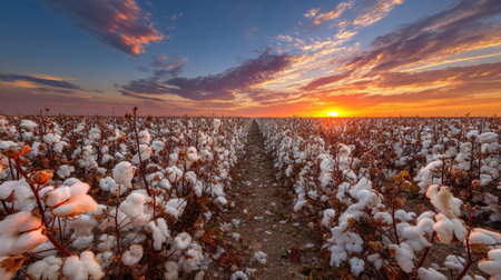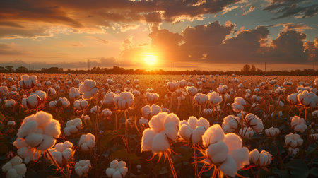 A stunning cotton field bathed in warm sunset light, with fluffy cotton bolls set against a colorful sky. This serene landscape captures the essence of rural agriculture.