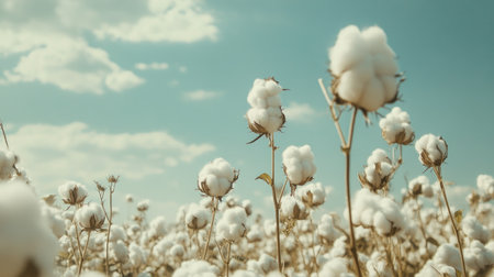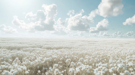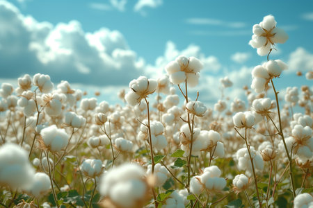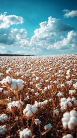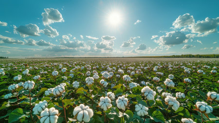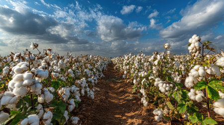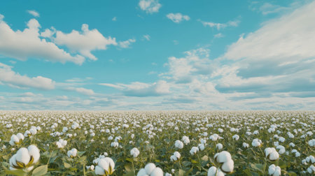 A serene cotton field stretches under a bright blue sky, dotted with soft, fluffy clouds. This picturesque landscape captures the beauty of nature in an agricultural setting.