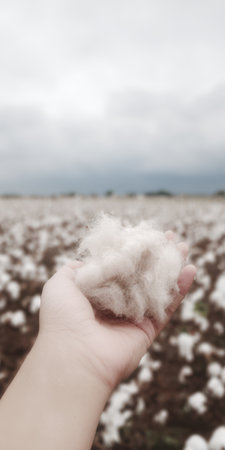 Hand holding freshly picked fluffy organic cotton boll over blurred cotton field, symbolizing sustainable farming, natural textile fiber and rural harvest under cloudy sky