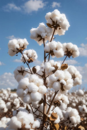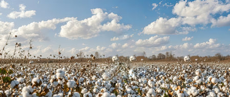 Scenic cotton field landscape with blooming cotton bolls under a blue sky