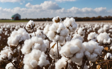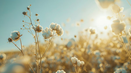 A cotton plant field, cotton balls, light blue sky, sunlit, light blurred background