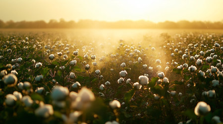 Golden sunlight illuminates a vast cotton field at sunrise, rows of plants gently swaying, creating a tranquil and natural scene