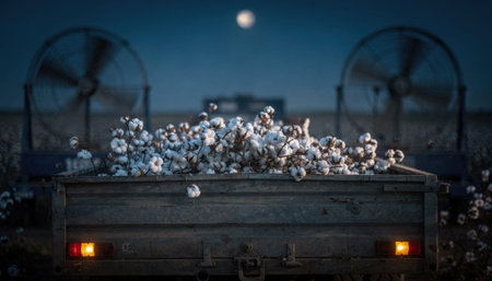 Focused medium shot of a trailer gently collecting cotton stems framed by blurred trash fans operating quietly in the dim calm night air.