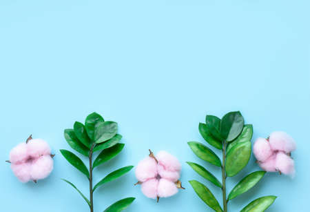 Blue background with branches of green leaves and cotton flowers. A place for text. View from above. Flat lay