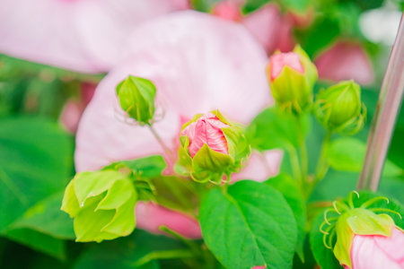 Hibiscus Syriacus Ardens or Deciduous Hibiscus with bud and green leaves, pink flowering plants growing in subtropical and tropical regions in the world. Vibrant large background for wallpaper or web design.