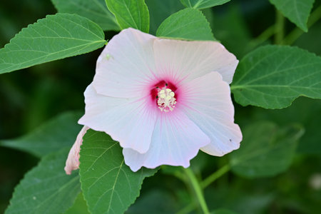 Hibiscus moscheutos of Malvaceae family. Blooming flower close up. Floral background. Shallow depth of field.