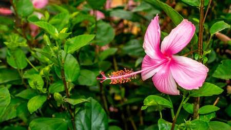 Beautiful Flower, Fresh Pink Hibiscus or Bunga Raya Flowers on Green Leaves Blooming in Green Garden.