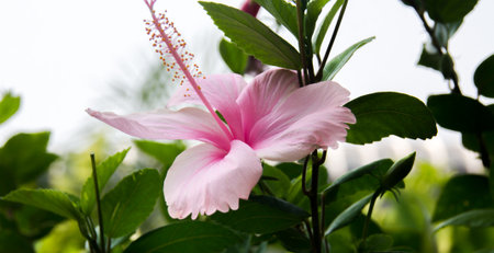 Light pink Hibiscus flower with green leaves. Natural background
