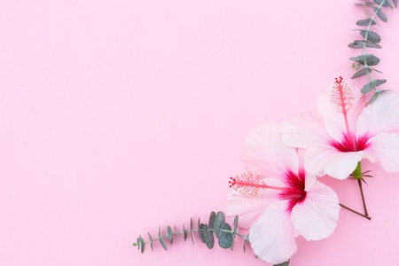 Wellness background with hibiscus flowers and eucaliptus twigs on pink with copy space