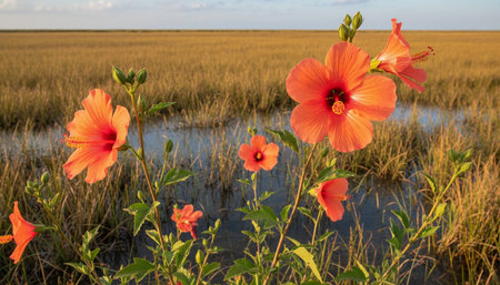 A wide shot of Hibiscus swaying gently in the wind, realistic photography style, bright and vivid colors, natural lighting.