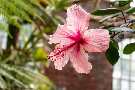 hibiscus pink flower on branch, close up shot