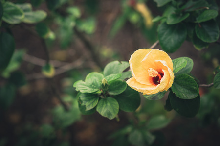 yellow hibiscus in pot outdoor, shot at shallow depth of field