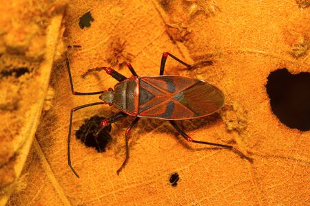 Small black and red seed bug at field ground, over a dry stem. Side view of Spilostethus pandurus, insect belonging to the family Lygaeidae