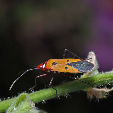 small milkweed bug , common milkweed bug (Lygaeus kalmii) , An orange winged insect with black dots settles on a branch of a plant in nature against a blurred background.