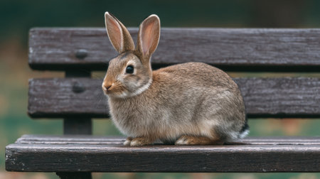 A charming brown rabbit is seen sitting on a wooden bench, showcasing its soft fur and alert ears in a tranquil outdoor environment.
