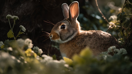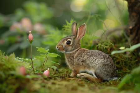 Adorable wild rabbit sits peacefully among forest foliage and flowers