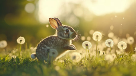 A charming rabbit joyfully hops through a sunlit field filled with dandelions, showcasing the vibrant beauty of nature during springtime.