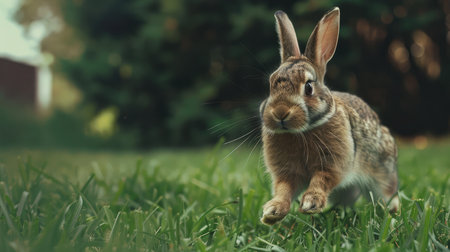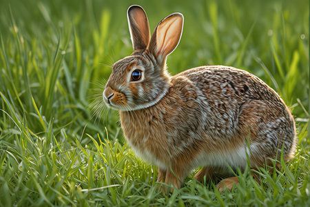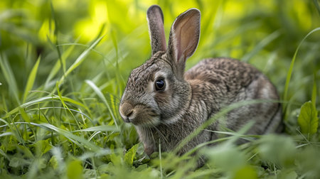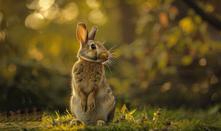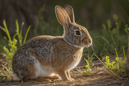A brown rabbit sits amidst lush green vegetation, bathed in warm sunlight. The image showcases a natural outdoor scene with a soft focus background of trees. The composition includes vibrant colors and a shallow depth of field, suitable for various editorial and commercial applications.