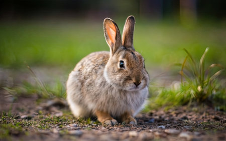 Rabbit sitting in the grass looking at the camera with a blurred background