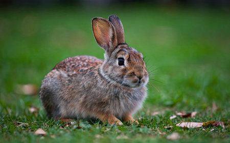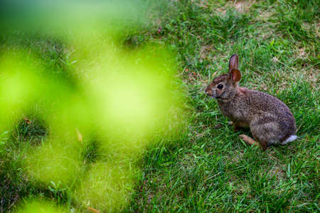 Rabbit on green grass in the garden, selective focus, shallow DOF