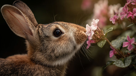 A charming close-up shot of a rabbit delicately sniffing a pink flower in a vibrant garden, capturing the beauty of nature and the innocence of wildlife.