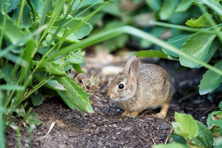 A charming brown rabbit sits quietly among vibrant green leaves, capturing the essence of a tranquil garden scene. Ideal for nature and wildlife themes.
