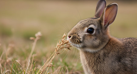 A wild brown rabbit is captured in profile as it sniffs and nibbles on dry grass stalks in a field. The close-up portrait showcases the animal's soft fur, whiskers, and alert eye in a natural habitat.