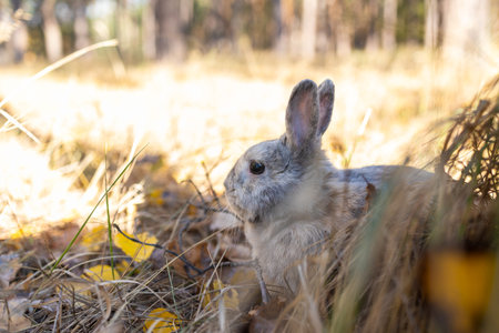Cute rabbit in the autumn forest. Wild animal in the nature.