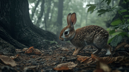 A curious rabbit exploring a forest floor, sniffing the leaves and twigs along its path.