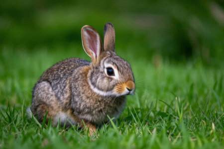 Fluffy baby rabbit sitting in green meadow generated by artificial intelligence