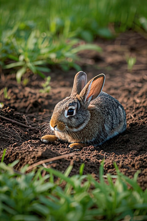 A detailed close-up shows a rabbit peeking out of dark soil. The animal displays a mix of brown and gray fur with large, dark eyes. The composition offers a high-angle perspective, with natural lighting creating shadows. This image could be suitable for a variety of editorial or commercial purposes.
