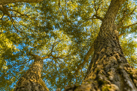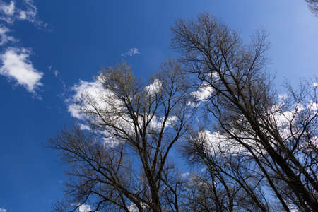 Young poplar forest on springtime, Valdelacalzada, Spain. low-angle view