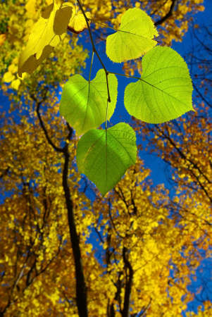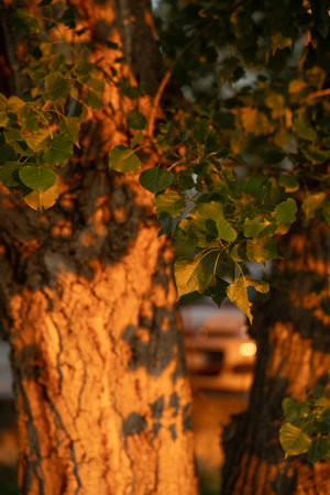 Twig of poplar Populus cover with sunlit autumnal foliage, Sofia, Bulgaria